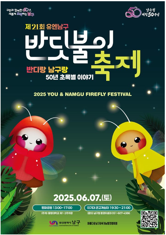 부산 남구에서는 개청 50주년을 맞아 '반디랑 남구랑 50년 초록별 이야기'를 주제로 다가올 50년과 반딧불이, 구가 함께 빛나는 공존과 미래에 대해 이야기를 축제에 담을 예정입니다.